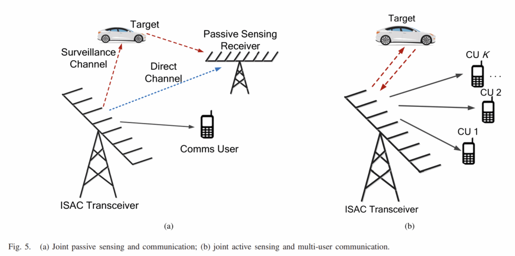 b) ISAC transceiver with communication and sensing using a single base station. Source: [1]